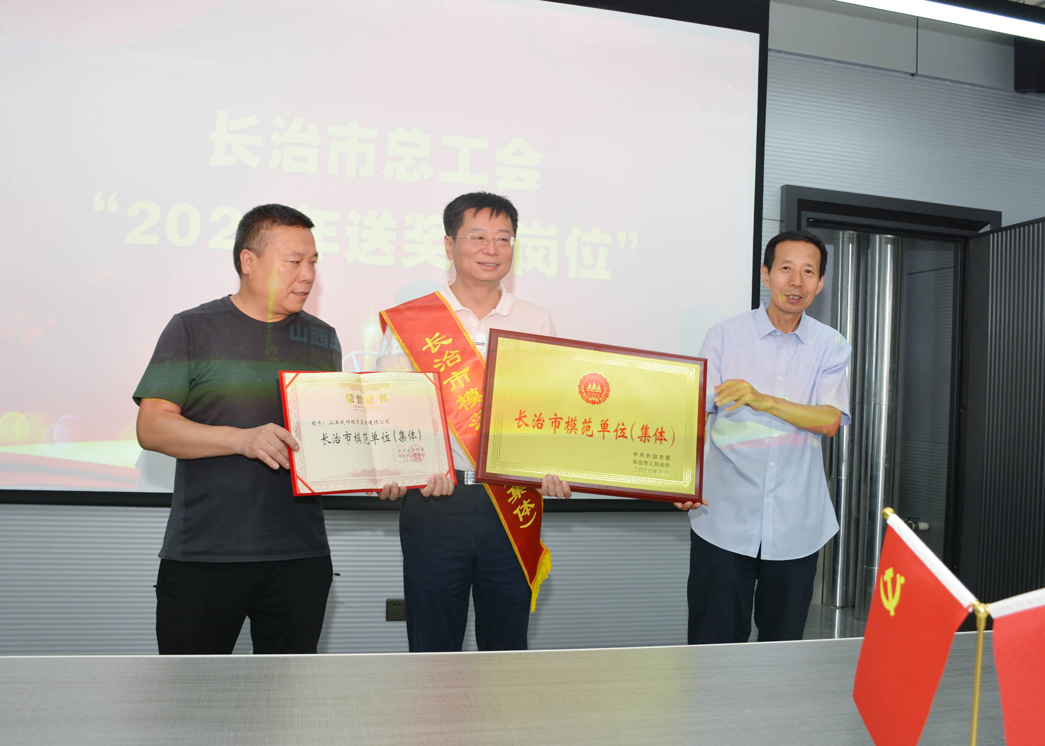 8月12日上午,长治市人大常委会副主任、市总工会主席崔建泰、上党区人大常委会副主任李旭铭、上党区总工会常务主席任书堂、长治市总工会组织部部长赵雪堂一行深入sunbet申搏开展“2020年送奖到岗位”活动,为荣获“长治市模范单位(集体)”的sunbet申搏现场进行了颁奖仪式。sunbet申搏常务副总裁马帅、党委书记陈建法、副总裁赵安平及集团各职能部门负责人参加了颁奖仪式。