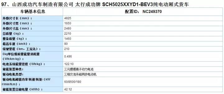 该车型是成功汽车新开发的产品,整车长宽高为4825×1650×2480(mm),轴距为2850mm,总质量2210kg,整备质量1460kg,额定载质量620kg。厢货尺寸长2560、 宽1525 、高 1565,超大的货厢空间及载物能力,可满足不同行业货运需求。动力电池方面搭载了广西卓能新能源科技有限公司三元锂电池,搭载电量为42.12kWh,Ekg单位载质量能量消耗量为0.49Wh/km・kg,续航里程达到210km。电机方面搭载河南天勤自控科技有限公司永磁同步电机,电机额定功率为30kW,峰值功率为60kW。充电方面快充2―3.5小时,慢充12―14小时。